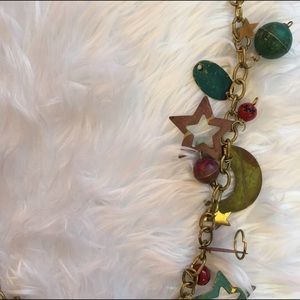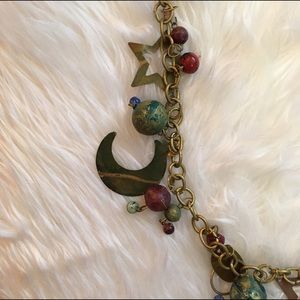 Make a bold statement with this necklace! Large antique gold colored chain necklace. Charm drops are multi colored metal orbs as well as flat stars and moons. Colors include turquoise, fuchsia and red. All metal but not heavy at all. Hook closure is adjustable to different lengths. So perfect for making a basic outfit super fun or adding even more festival flair.
