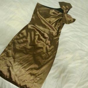 Dark gold satin one shoulder dress, large bow at left shoulder. Purchased at topshop in london 2010. Worn one, like new. 92% polyester, not high quality but good for a teenager.