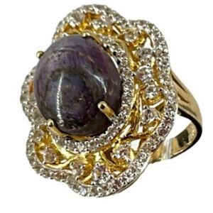 Gold Over Sterling Gemstone Cocktail Ring Size (8) split tapered shank ring with a (14.1mm x 11.5mm) light purple sapphire center stone with a schiller effect, surrounded by a lovely openwork design featuring clear sapphires, stamped and tested (0.38 troy oz tw).
