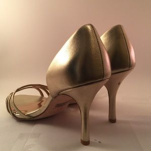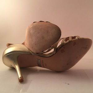 Beautiful, brand new, gold stiletto heels never worn but has a blemish. A scuff on the heel from improper handling. Awesome looking party shoe!