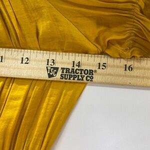 Gold puff sleeve smocked top Sz S boat neckline wide elastic waist, satin feel