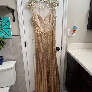A beautiful gold sequin backless dress, no itch beautiful back opening long ball gown. Worn once. No tears, stretching or marks. WILLING TO NEGOTIATE PRICE!!