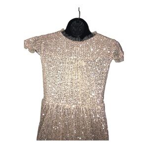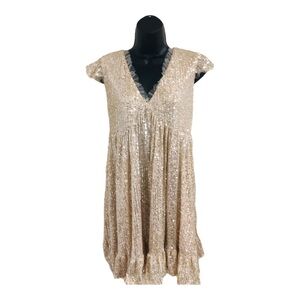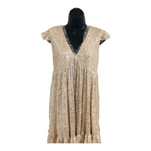 Gold shimmery sequin lace trim v-neck babydoll swing tent dress size medium new
