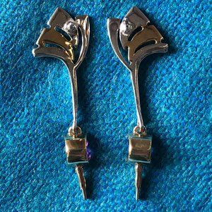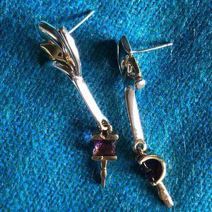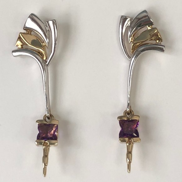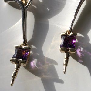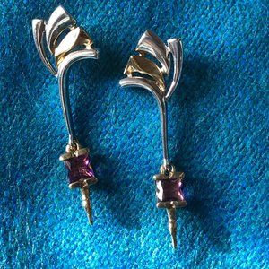 Unique artist-made earrings. combining gold and silver. Like a drop earring, with the dangle near the bottom (the amethyst part). I took these to a jeweler for some clues and was told they are sterling silver and gold--possibly plated gold. The earring length is just a bit over two inches.