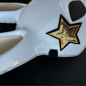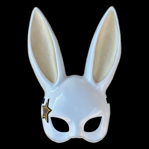 “Gold star” Bunny Rabbit Mask has gold faux leather ears, a gold star over eye, and AB rhinestone trim around full mask.