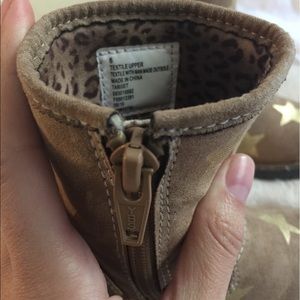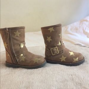 Brown boots with gold shiny stars. Zip up. Size 5. From Target. Lightly worn. They fit my daughter who is 1 year old.