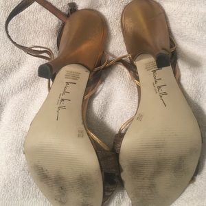 Gold, strapped Nicole Miller heels.