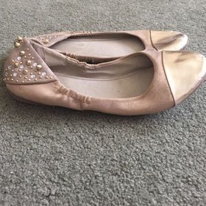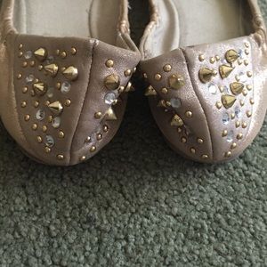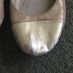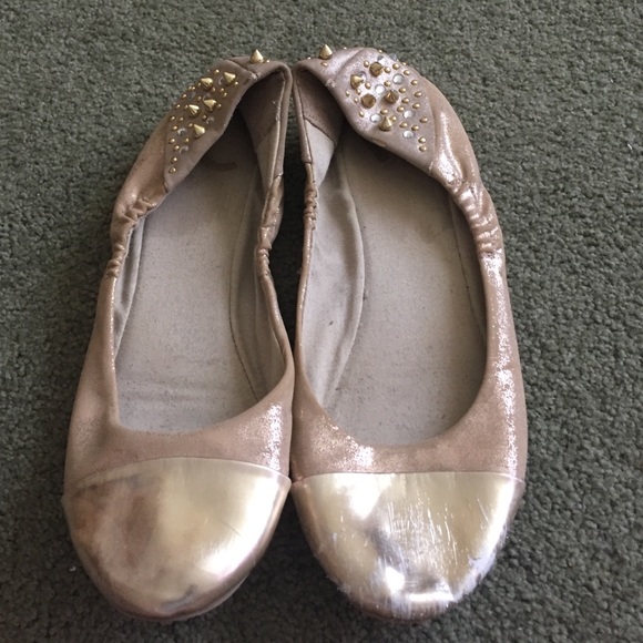 Gold ballet flats with gold toe and studded heel. Left shoe has some wear and tear on the toe, as shown in the last picture