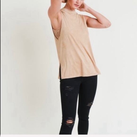 This super cute camel-colored top is made of a soft suede-like material. It features a beautiful crochet panel down the back and under the arms, adding a touch of unique detail. The top fits true to size, ensuring a comfortable and flattering fit. Get ready to turn heads in this stylish and versatile piece!