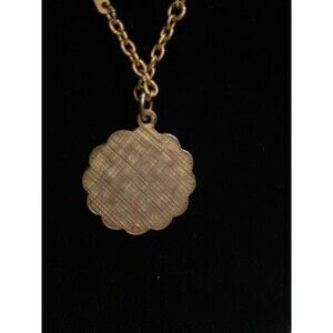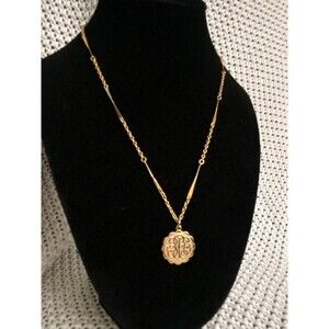 17 inch gold tone necklace with monogram script design pendant on a beautiful gold tone chain. The chain features a unique design perfect for any occasion or everyday wear. I would suggest a replacement hoop to hold the pendant on the chain as it has more of a silver tone but is perfectly fine the way it is as well.