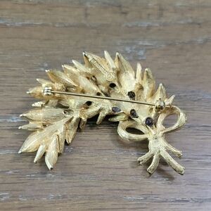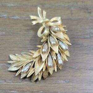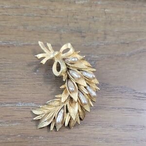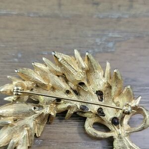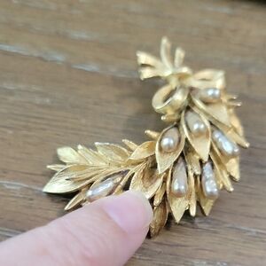 This stunning gold tone Florenza brooch showcases a graceful, nature-inspired design with layered metallic leaves and delicate pearl-like accents. Its elegant, sweeping curve and fine metalwork detail make it a timeless piece, perfect for adding a touch of sophistication to any ensemble. Missing 1 pearl see photos