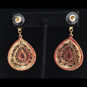 Gold tone with Teal colored stones. These are not flimsy earrings, but they're not heavy either. They're very comfortable to wear. They'll add such a POP of color to an outfit!