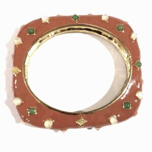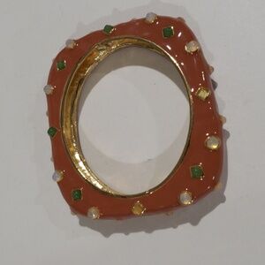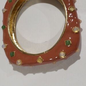 Add a touch of bold elegance to your look with this gold-tone bangle featuring Salmon pink enamel and colorful accents. This chunky, dainty bracelet is perfect for women seeking a statement piece to enhance their outfits. Its unique combination of boldness and subtlety makes it an essential addition to any jewelry collection.
