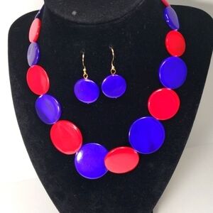 A beautiful combination of gold-tone Red and Blue discs Beaded Statement Necklace with matching Earrings. The Necklace is about 16 inches long and has a 3.5 inches Extender. Shelf pull item, New without tag.