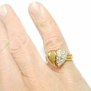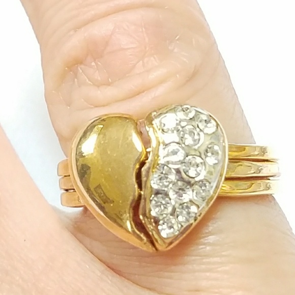 Wear this ring to signal your heart is broken, or that it is on the mend by that new special someone! Unmarked goldtone metal with clear rhinestones. Size 6.5.