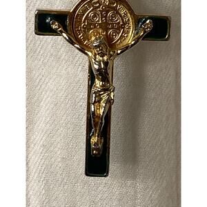 Gold tone St. Benedict Crucifix Pendant Necklace on Heavy Gold tone box chain. Bright gold metal on forest green enamel crucifix. This is a real statement piece. Religious, Catholic, Cross. Pendant / Crucifix is Approximately 3 in X 1 ½ in. Chain is 31 inches long.