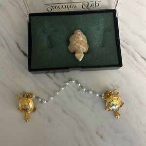 This vintage sweater grip set is in original box with 8 in long clip and cute stone turtle