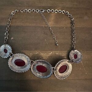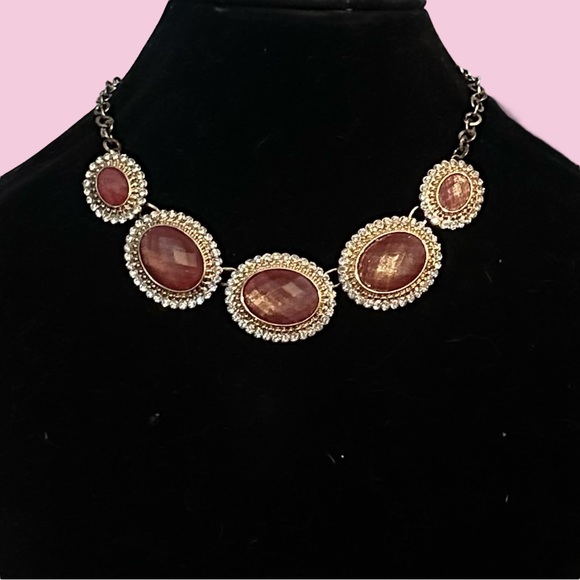 In great preowned condition. Gold tone chain with five gold tone oval links with a rosy brown shimmery faceted cabochon stone. Small clear rhinestone trim on each one. Lobster claw clasp. 16” with a 3” extender.