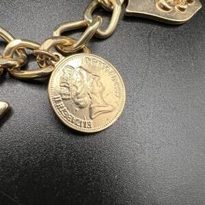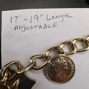 Gold tone charm coins necklace Fleur De Leis shield Queen Elizabeth statement