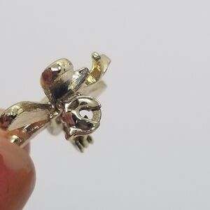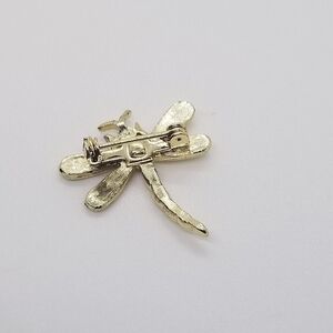 Dragonfly pin or brooch in a gold colored metal. No markings to indicate brand or metal content. Quarter shown for scale, will not be included with your order. In good used condition with no known flaws