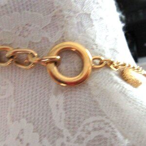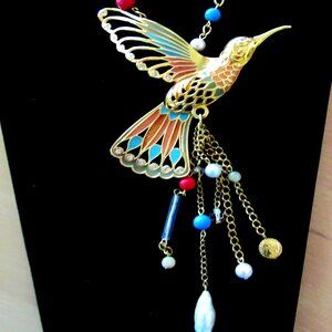 Gold tone enamel, bead & rhinestone hummingbird pendant signed MW - 7" length!