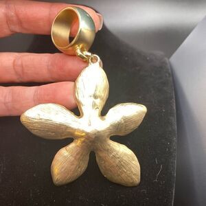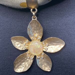 Gold tone flower scarf charm with rhinestones and opal like stone in center 3”