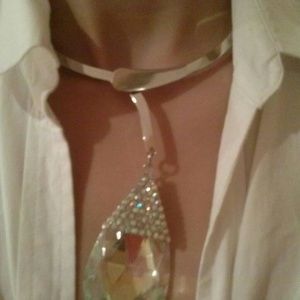 Gold high Polish neck collar with hanging tear drop crystal and accent rhinestones triangle charm