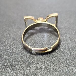 Adorable adjustable gold colored ring is a bow with a red rhinestone.