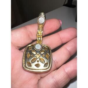 This is a stunning gold-tone pendant with a pavé setting of rhinestones. The pendant has a magnetic closure and is made of rhinestone material.
