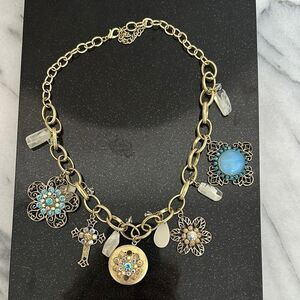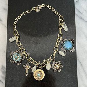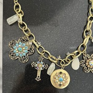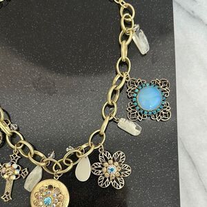 Elegant gold necklace featuring blue and gold charms. Perfect for adding a touch of sophistication to any outfit.