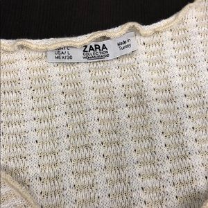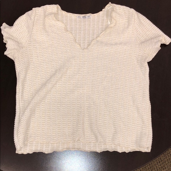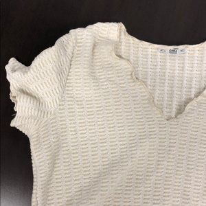V neck, metallic top. Fitted, comes to hips. Ruffled hems