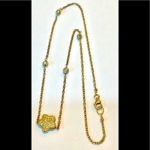 Beautiful gold covered sterling silver delicate necklace with a crystal covered CZ. I do not see any missing stones but I might have missed one. It will come carded and in plastic so the chain doesn’t tangle. thank you so much