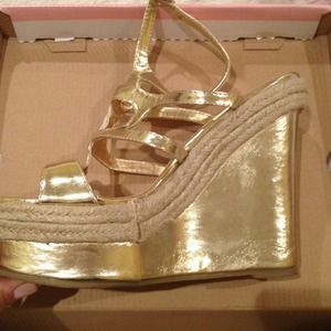 Never worn in brand new condition ... Beautiful for summer... Gold wedge that closes around the ankle.. Very confortable and stylish!