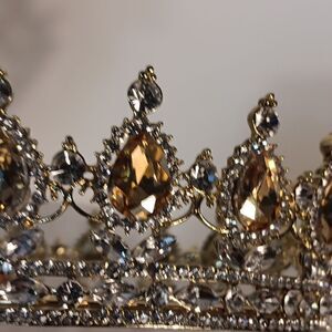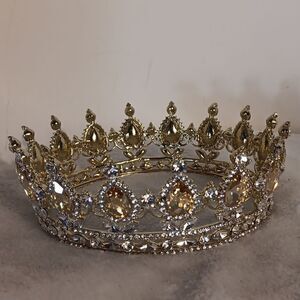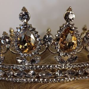 This absolutely stunning gold and clear stone bridal tiara is a one size has four areas for pinning to hair. In excellent condition. No stones missing. Has some weight to it. All offers are welcome.