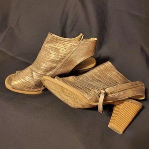 used them that one time. Color is dusty gold. Added heel height and side view as requested.