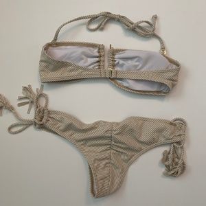 Very gently used and in great condition! Gold metallic details Sexy scrunched butt on bottoms. Tags/sizes have been removed Sizing: Top is S and bottoms are M! Love this suit!
