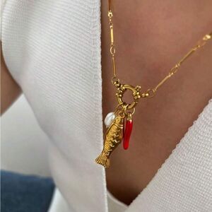 Elegant gold necklace featuring a fish pendant and a striking red accent. Perfect for adding a touch of sophistication to any outfit. 18k gold plated hardware waterproof