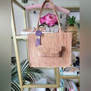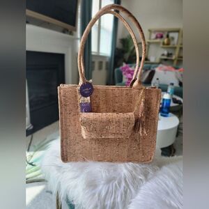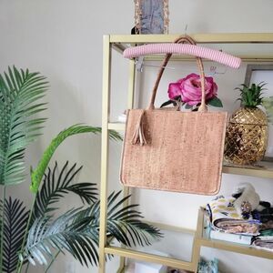 Get ready for summer with this gorgeous and natural corkscrew beach tote bag! The Corkscrew purse is speckled with gold specks and is adorned with fringe.
