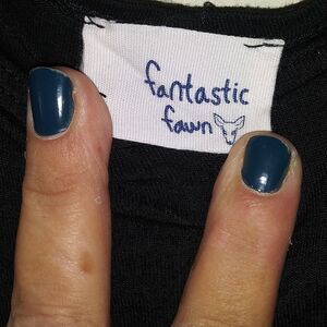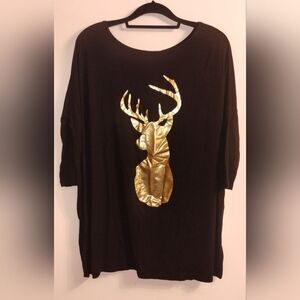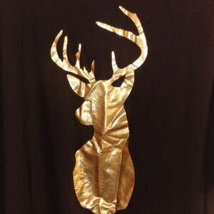 Very cute gold mousse applique on a black T-shirt with three quarter inch sleeves. There is no size tag and a shirt it's been cut out but it's definitely a 2X to a 3X.