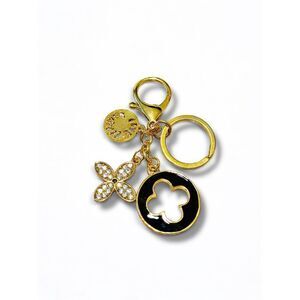 Featuring an intricately designed crystal-studded flower charm, a black enamel circular charm with a cutout floral motif, and a gold-tone disc with an engraved design, this keychain is both practical and chic.