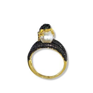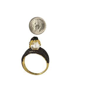New! Gold Plated and Black Rhodium Accented Split bands, Round Green and Red Cubic Zirconia Frog on Faux Pearl Ring Size 9.5