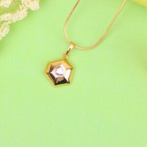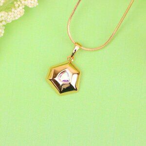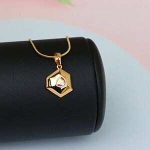 Satin white hexagonal pendant with iridescent center stone, gold-plated.