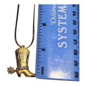 This vintage necklace features a gold-plated boot pendant, adorned with rhinestones, reminiscent of the Old West's charm. Its intricate details evoke a bygone era when the frontier was untamed and stories were told around campfires. A timeless piece that pairs well with both casual and dressy attire, making it an elegant addition to any jewelry collection.