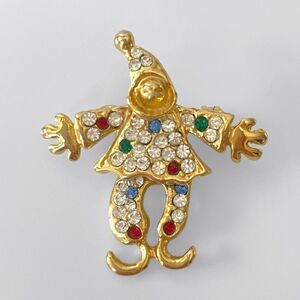 Gold Tone Rhinestone Studded Jester Clown Brooch Pin. His legs dangle and move. In excellent condition. Measures 1.25”L x 1.25”W