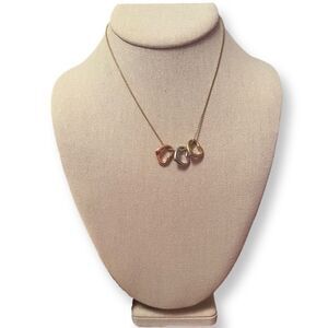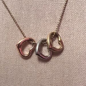 Three small heart-shapes pendants in gold, silver, and rose gold. They are three separate pendants so you can wear only one if you want.