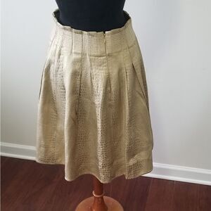 Preowned Pleated Gold Skater Skirt with Zipper Closure. Shirt is in excellent used condition.