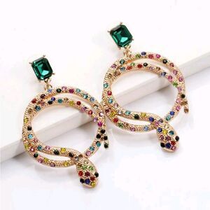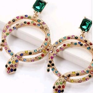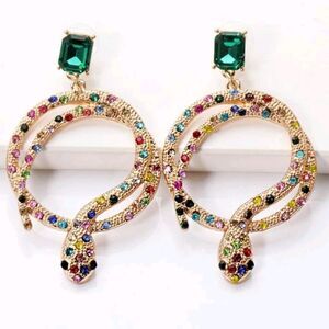Gold Snake Hoop Earrings with Rainbow Rhinestones