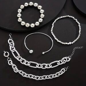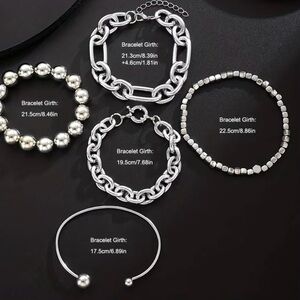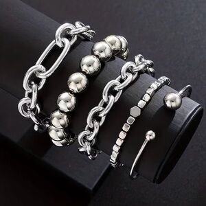 Elegant gold-tone bracelet set featuring 5 mixed chains and beaded links. Designed for layered styling and everyday wear. Polished gold finish adds a luxe shine to any outfit.