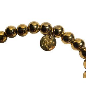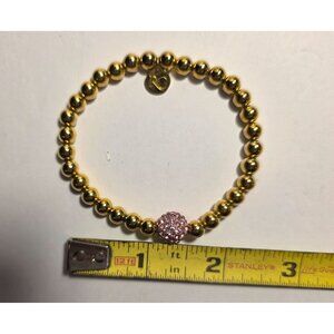 A stylish gold-tone beaded bracelet featuring a pink crystal accent and Rustic Cuff charm. Its stretch design ensures a comfortable fit and ease of wear.