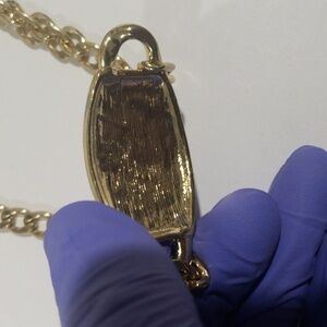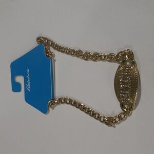 This striking gold-tone necklace features a bold design with a centerpiece displaying sparkling crystal-studded lettering. The chunky chain and eye-catching details make this necklace the perfect statement piece to elevate any outfit. This necklace embodies confidence and unique style and is ideal for casual wear or bold fashion statements.